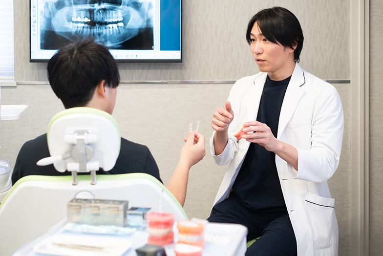 患者さんの歯並びの状態や、治療の進み具合によって通院間隔は異なります。約3週間〜8週間に1度来院していただき、矯正装置の調整を行います。装着中はむし歯や歯周病のリスクを抑えるために、定期的に歯のクリーニングをおすすめしています。